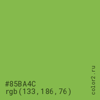 Цвет #85BA4C в цветовой модели RGB обозначается тремя октетами (133, 186, 76) в десятичном формате и #85BA4C в шестнадцатиричном (hex) формате, которые являются интенсивностью красного 133 (hex 85), интенсивность зелёного 186 (hex BA) и интенсивность синего 76 (hex 4C).