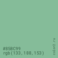 Цвет #85BC99 в цветовой модели RGB обозначается тремя октетами (133, 188, 153) в десятичном формате и #85BC99 в шестнадцатиричном (hex) формате, которые являются интенсивностью красного 133 (hex 85), интенсивность зелёного 188 (hex BC) и интенсивность синего 153 (hex 99).