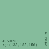 Цвет #85BC9C в цветовой модели RGB обозначается тремя октетами (133, 188, 156) в десятичном формате и #85BC9C в шестнадцатиричном (hex) формате, которые являются интенсивностью красного 133 (hex 85), интенсивность зелёного 188 (hex BC) и интенсивность синего 156 (hex 9C).