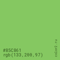 Цвет #85C861 в цветовой модели RGB обозначается тремя октетами (133, 200, 97) в десятичном формате и #85C861 в шестнадцатиричном (hex) формате, которые являются интенсивностью красного 133 (hex 85), интенсивность зелёного 200 (hex C8) и интенсивность синего 97 (hex 61).