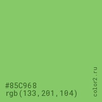 Цвет #85C968 в цветовой модели RGB обозначается тремя октетами (133, 201, 104) в десятичном формате и #85C968 в шестнадцатиричном (hex) формате, которые являются интенсивностью красного 133 (hex 85), интенсивность зелёного 201 (hex C9) и интенсивность синего 104 (hex 68).