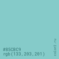Цвет #85CBC9 в цветовой модели RGB обозначается тремя октетами (133, 203, 201) в десятичном формате и #85CBC9 в шестнадцатиричном (hex) формате, которые являются интенсивностью красного 133 (hex 85), интенсивность зелёного 203 (hex CB) и интенсивность синего 201 (hex C9).