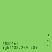 Цвет #85D162 в цветовой модели RGB обозначается тремя октетами (133, 209, 98) в десятичном формате и #85D162 в шестнадцатиричном (hex) формате, которые являются интенсивностью красного 133 (hex 85), интенсивность зелёного 209 (hex D1) и интенсивность синего 98 (hex 62).