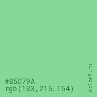 Цвет #85D79A в цветовой модели RGB обозначается тремя октетами (133, 215, 154) в десятичном формате и #85D79A в шестнадцатиричном (hex) формате, которые являются интенсивностью красного 133 (hex 85), интенсивность зелёного 215 (hex D7) и интенсивность синего 154 (hex 9A).