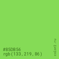 Цвет #85DB56 в цветовой модели RGB обозначается тремя октетами (133, 219, 86) в десятичном формате и #85DB56 в шестнадцатиричном (hex) формате, которые являются интенсивностью красного 133 (hex 85), интенсивность зелёного 219 (hex DB) и интенсивность синего 86 (hex 56).