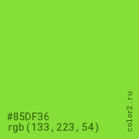 Цвет #85DF36 в цветовой модели RGB обозначается тремя октетами (133, 223, 54) в десятичном формате и #85DF36 в шестнадцатиричном (hex) формате, которые являются интенсивностью красного 133 (hex 85), интенсивность зелёного 223 (hex DF) и интенсивность синего 54 (hex 36).