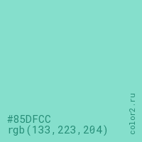 Цвет #85DFCC в цветовой модели RGB обозначается тремя октетами (133, 223, 204) в десятичном формате и #85DFCC в шестнадцатиричном (hex) формате, которые являются интенсивностью красного 133 (hex 85), интенсивность зелёного 223 (hex DF) и интенсивность синего 204 (hex CC).