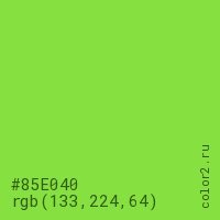 Цвет #85E040 в цветовой модели RGB обозначается тремя октетами (133, 224, 64) в десятичном формате и #85E040 в шестнадцатиричном (hex) формате, которые являются интенсивностью красного 133 (hex 85), интенсивность зелёного 224 (hex E0) и интенсивность синего 64 (hex 40).