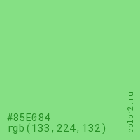 Цвет #85E084 в цветовой модели RGB обозначается тремя октетами (133, 224, 132) в десятичном формате и #85E084 в шестнадцатиричном (hex) формате, которые являются интенсивностью красного 133 (hex 85), интенсивность зелёного 224 (hex E0) и интенсивность синего 132 (hex 84).