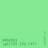 Цвет #85E893 в цветовой модели RGB обозначается тремя октетами (133, 232, 147) в десятичном формате и #85E893 в шестнадцатиричном (hex) формате, которые являются интенсивностью красного 133 (hex 85), интенсивность зелёного 232 (hex E8) и интенсивность синего 147 (hex 93).