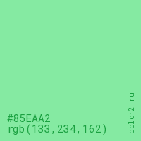 Цвет #85EAA2 в цветовой модели RGB обозначается тремя октетами (133, 234, 162) в десятичном формате и #85EAA2 в шестнадцатиричном (hex) формате, которые являются интенсивностью красного 133 (hex 85), интенсивность зелёного 234 (hex EA) и интенсивность синего 162 (hex A2).