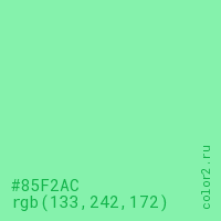 Цвет #85F2AC в цветовой модели RGB обозначается тремя октетами (133, 242, 172) в десятичном формате и #85F2AC в шестнадцатиричном (hex) формате, которые являются интенсивностью красного 133 (hex 85), интенсивность зелёного 242 (hex F2) и интенсивность синего 172 (hex AC).