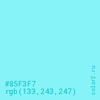 Цвет #85F3F7 в цветовой модели RGB обозначается тремя октетами (133, 243, 247) в десятичном формате и #85F3F7 в шестнадцатиричном (hex) формате, которые являются интенсивностью красного 133 (hex 85), интенсивность зелёного 243 (hex F3) и интенсивность синего 247 (hex F7).