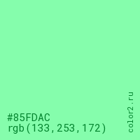 Цвет #85FDAC в цветовой модели RGB обозначается тремя октетами (133, 253, 172) в десятичном формате и #85FDAC в шестнадцатиричном (hex) формате, которые являются интенсивностью красного 133 (hex 85), интенсивность зелёного 253 (hex FD) и интенсивность синего 172 (hex AC).