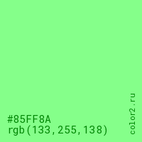 Цвет #85FF8A в цветовой модели RGB обозначается тремя октетами (133, 255, 138) в десятичном формате и #85FF8A в шестнадцатиричном (hex) формате, которые являются интенсивностью красного 133 (hex 85), интенсивность зелёного 255 (hex FF) и интенсивность синего 138 (hex 8A).