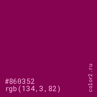 Цвет #860352 в цветовой модели RGB обозначается тремя октетами (134, 3, 82) в десятичном формате и #860352 в шестнадцатиричном (hex) формате, которые являются интенсивностью красного 134 (hex 86), интенсивность зелёного 3 (hex 03) и интенсивность синего 82 (hex 52).