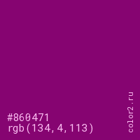 Цвет #860471 в цветовой модели RGB обозначается тремя октетами (134, 4, 113) в десятичном формате и #860471 в шестнадцатиричном (hex) формате, которые являются интенсивностью красного 134 (hex 86), интенсивность зелёного 4 (hex 04) и интенсивность синего 113 (hex 71).
