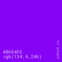 Цвет #8604F6 в цветовой модели RGB обозначается тремя октетами (134, 4, 246) в десятичном формате и #8604F6 в шестнадцатиричном (hex) формате, которые являются интенсивностью красного 134 (hex 86), интенсивность зелёного 4 (hex 04) и интенсивность синего 246 (hex F6).