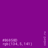Цвет #86058D в цветовой модели RGB обозначается тремя октетами (134, 5, 141) в десятичном формате и #86058D в шестнадцатиричном (hex) формате, которые являются интенсивностью красного 134 (hex 86), интенсивность зелёного 5 (hex 05) и интенсивность синего 141 (hex 8D).