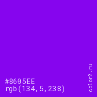 Цвет #8605EE в цветовой модели RGB обозначается тремя октетами (134, 5, 238) в десятичном формате и #8605EE в шестнадцатиричном (hex) формате, которые являются интенсивностью красного 134 (hex 86), интенсивность зелёного 5 (hex 05) и интенсивность синего 238 (hex EE).
