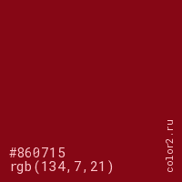 Цвет #860715 в цветовой модели RGB обозначается тремя октетами (134, 7, 21) в десятичном формате и #860715 в шестнадцатиричном (hex) формате, которые являются интенсивностью красного 134 (hex 86), интенсивность зелёного 7 (hex 07) и интенсивность синего 21 (hex 15).