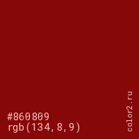 Цвет #860809 в цветовой модели RGB обозначается тремя октетами (134, 8, 9) в десятичном формате и #860809 в шестнадцатиричном (hex) формате, которые являются интенсивностью красного 134 (hex 86), интенсивность зелёного 8 (hex 08) и интенсивность синего 9 (hex 09).