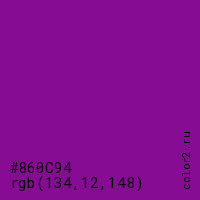Цвет #860C94 в цветовой модели RGB обозначается тремя октетами (134, 12, 148) в десятичном формате и #860C94 в шестнадцатиричном (hex) формате, которые являются интенсивностью красного 134 (hex 86), интенсивность зелёного 12 (hex 0C) и интенсивность синего 148 (hex 94).