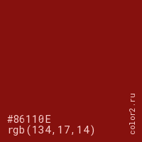 Цвет #86110E в цветовой модели RGB обозначается тремя октетами (134, 17, 14) в десятичном формате и #86110E в шестнадцатиричном (hex) формате, которые являются интенсивностью красного 134 (hex 86), интенсивность зелёного 17 (hex 11) и интенсивность синего 14 (hex 0E).