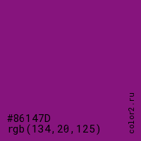 Цвет #86147D в цветовой модели RGB обозначается тремя октетами (134, 20, 125) в десятичном формате и #86147D в шестнадцатиричном (hex) формате, которые являются интенсивностью красного 134 (hex 86), интенсивность зелёного 20 (hex 14) и интенсивность синего 125 (hex 7D).