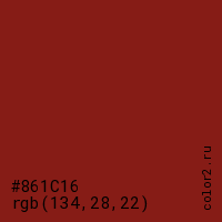 Цвет #861C16 в цветовой модели RGB обозначается тремя октетами (134, 28, 22) в десятичном формате и #861C16 в шестнадцатиричном (hex) формате, которые являются интенсивностью красного 134 (hex 86), интенсивность зелёного 28 (hex 1C) и интенсивность синего 22 (hex 16).