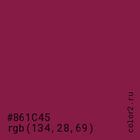 Цвет #861C45 в цветовой модели RGB обозначается тремя октетами (134, 28, 69) в десятичном формате и #861C45 в шестнадцатиричном (hex) формате, которые являются интенсивностью красного 134 (hex 86), интенсивность зелёного 28 (hex 1C) и интенсивность синего 69 (hex 45).