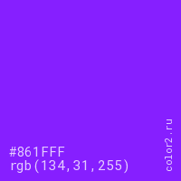 Цвет #861FFF в цветовой модели RGB обозначается тремя октетами (134, 31, 255) в десятичном формате и #861FFF в шестнадцатиричном (hex) формате, которые являются интенсивностью красного 134 (hex 86), интенсивность зелёного 31 (hex 1F) и интенсивность синего 255 (hex FF).
