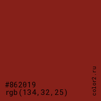 Цвет #862019 в цветовой модели RGB обозначается тремя октетами (134, 32, 25) в десятичном формате и #862019 в шестнадцатиричном (hex) формате, которые являются интенсивностью красного 134 (hex 86), интенсивность зелёного 32 (hex 20) и интенсивность синего 25 (hex 19).