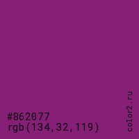 Цвет #862077 в цветовой модели RGB обозначается тремя октетами (134, 32, 119) в десятичном формате и #862077 в шестнадцатиричном (hex) формате, которые являются интенсивностью красного 134 (hex 86), интенсивность зелёного 32 (hex 20) и интенсивность синего 119 (hex 77).