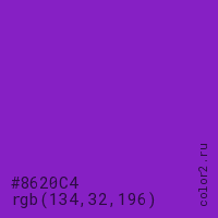 Цвет #8620C4 в цветовой модели RGB обозначается тремя октетами (134, 32, 196) в десятичном формате и #8620C4 в шестнадцатиричном (hex) формате, которые являются интенсивностью красного 134 (hex 86), интенсивность зелёного 32 (hex 20) и интенсивность синего 196 (hex C4).