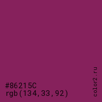 Цвет #86215C в цветовой модели RGB обозначается тремя октетами (134, 33, 92) в десятичном формате и #86215C в шестнадцатиричном (hex) формате, которые являются интенсивностью красного 134 (hex 86), интенсивность зелёного 33 (hex 21) и интенсивность синего 92 (hex 5C).