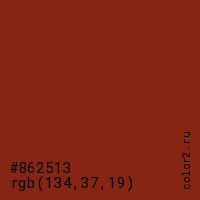 Цвет #862513 в цветовой модели RGB обозначается тремя октетами (134, 37, 19) в десятичном формате и #862513 в шестнадцатиричном (hex) формате, которые являются интенсивностью красного 134 (hex 86), интенсивность зелёного 37 (hex 25) и интенсивность синего 19 (hex 13).