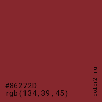 Цвет #86272D в цветовой модели RGB обозначается тремя октетами (134, 39, 45) в десятичном формате и #86272D в шестнадцатиричном (hex) формате, которые являются интенсивностью красного 134 (hex 86), интенсивность зелёного 39 (hex 27) и интенсивность синего 45 (hex 2D).