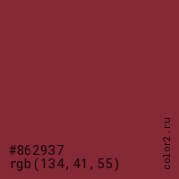 Цвет #862937 в цветовой модели RGB обозначается тремя октетами (134, 41, 55) в десятичном формате и #862937 в шестнадцатиричном (hex) формате, которые являются интенсивностью красного 134 (hex 86), интенсивность зелёного 41 (hex 29) и интенсивность синего 55 (hex 37).