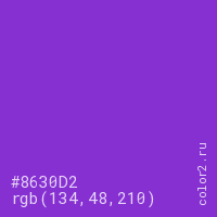 Цвет #8630D2 в цветовой модели RGB обозначается тремя октетами (134, 48, 210) в десятичном формате и #8630D2 в шестнадцатиричном (hex) формате, которые являются интенсивностью красного 134 (hex 86), интенсивность зелёного 48 (hex 30) и интенсивность синего 210 (hex D2).