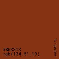 Цвет #863313 в цветовой модели RGB обозначается тремя октетами (134, 51, 19) в десятичном формате и #863313 в шестнадцатиричном (hex) формате, которые являются интенсивностью красного 134 (hex 86), интенсивность зелёного 51 (hex 33) и интенсивность синего 19 (hex 13).