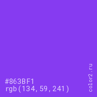 Цвет #863BF1 в цветовой модели RGB обозначается тремя октетами (134, 59, 241) в десятичном формате и #863BF1 в шестнадцатиричном (hex) формате, которые являются интенсивностью красного 134 (hex 86), интенсивность зелёного 59 (hex 3B) и интенсивность синего 241 (hex F1).
