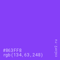 Цвет #863FF8 в цветовой модели RGB обозначается тремя октетами (134, 63, 248) в десятичном формате и #863FF8 в шестнадцатиричном (hex) формате, которые являются интенсивностью красного 134 (hex 86), интенсивность зелёного 63 (hex 3F) и интенсивность синего 248 (hex F8).
