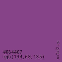 Цвет #864487 в цветовой модели RGB обозначается тремя октетами (134, 68, 135) в десятичном формате и #864487 в шестнадцатиричном (hex) формате, которые являются интенсивностью красного 134 (hex 86), интенсивность зелёного 68 (hex 44) и интенсивность синего 135 (hex 87).