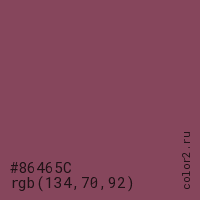 Цвет #86465C в цветовой модели RGB обозначается тремя октетами (134, 70, 92) в десятичном формате и #86465C в шестнадцатиричном (hex) формате, которые являются интенсивностью красного 134 (hex 86), интенсивность зелёного 70 (hex 46) и интенсивность синего 92 (hex 5C).