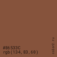 Цвет #86533C в цветовой модели RGB обозначается тремя октетами (134, 83, 60) в десятичном формате и #86533C в шестнадцатиричном (hex) формате, которые являются интенсивностью красного 134 (hex 86), интенсивность зелёного 83 (hex 53) и интенсивность синего 60 (hex 3C).