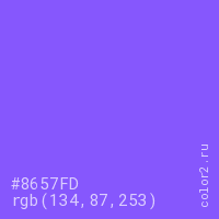 Цвет #8657FD в цветовой модели RGB обозначается тремя октетами (134, 87, 253) в десятичном формате и #8657FD в шестнадцатиричном (hex) формате, которые являются интенсивностью красного 134 (hex 86), интенсивность зелёного 87 (hex 57) и интенсивность синего 253 (hex FD).