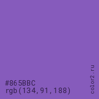 Цвет #865BBC в цветовой модели RGB обозначается тремя октетами (134, 91, 188) в десятичном формате и #865BBC в шестнадцатиричном (hex) формате, которые являются интенсивностью красного 134 (hex 86), интенсивность зелёного 91 (hex 5B) и интенсивность синего 188 (hex BC).