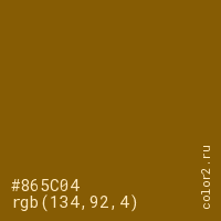 Цвет #865C04 в цветовой модели RGB обозначается тремя октетами (134, 92, 4) в десятичном формате и #865C04 в шестнадцатиричном (hex) формате, которые являются интенсивностью красного 134 (hex 86), интенсивность зелёного 92 (hex 5C) и интенсивность синего 4 (hex 04).