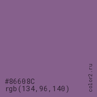 Цвет #86608C в цветовой модели RGB обозначается тремя октетами (134, 96, 140) в десятичном формате и #86608C в шестнадцатиричном (hex) формате, которые являются интенсивностью красного 134 (hex 86), интенсивность зелёного 96 (hex 60) и интенсивность синего 140 (hex 8C).